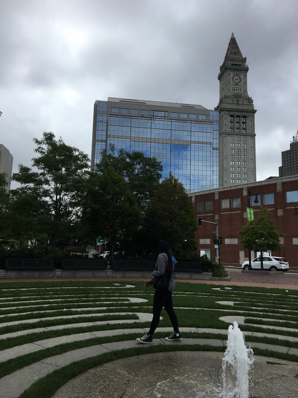From there we headed out on what turned out to be an unexpectedly adventurous day. We crossed the street to the Rose Kennedy Greenway, a long strip of greenery that cuts through Boston, a lovely by-product of the Big Dig. It’s dotted with unexpected diversions. We walked past the fountains and people swinging on the swings. We walked the labyrinth and saw the carousel. Walked through a garden, misted on a timer, trying not to get wet. We walked through a beer garden, not open for the day yet. Past a futuristic car with no wheels—a random piece of art—as well as lots of pig sculptures. When it started to rain, we opened our umbrellas and snapped pictures of the greenery and skyscrapers.